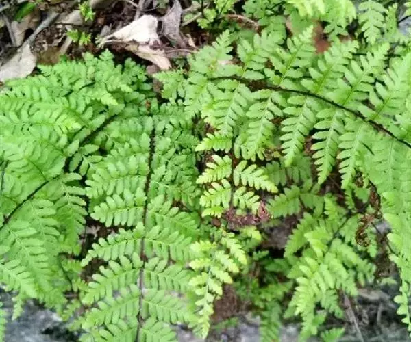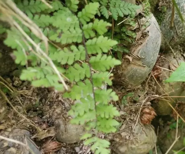 植株高10-30厘米。根状茎短而直立,被栗黑色披针形鳞片。叶簇生,柄长2-5厘米,亮栗色,密被红棕色披针形和钻状披针形鳞片以及少数短毛,向上直到叶轴上面有纵沟,沟两侧有隆起的锐边,其上有棕色粗短毛;叶片长8-25厘米,中部宽(2)4-6厘米,披针形,短渐尖头,向基部略变狭,二回羽状全裂;羽片10-20对,斜展,几无柄,中部羽片最大,长1.5-3.5厘米,基部宽1-1.5厘米,三角状披针形,先端短尖或钝,基部上侧与羽轴并行,下侧斜出,深羽裂;裂片长圆形或长舌形,无柄,或基部下延而有狭翅相连,钝头,边缘有圆齿;下部羽片略渐缩短,彼此疏离,有阔的间隔,基部一对三角形。叶脉在裂片上羽状,单一或分叉,极斜向上,两面不显。叶干后草质,绿色或棕绿色,两面无毛,羽轴下面下半部栗色,上半部绿色。孢子囊群圆形,生小脉顶端,位于裂片的圆齿上,每齿1-2枚;囊群盖椭圆肾形或圆肾形,黄绿色,宿存,彼此分离。 毛轴碎米蕨