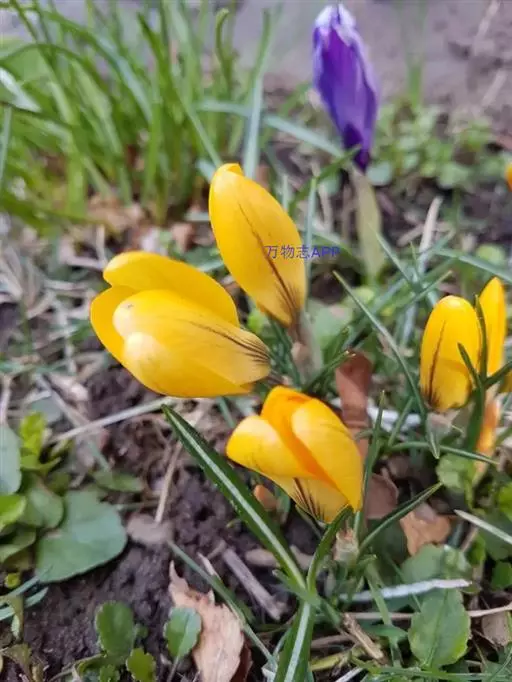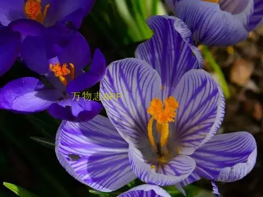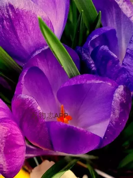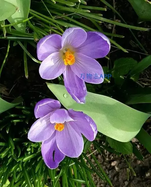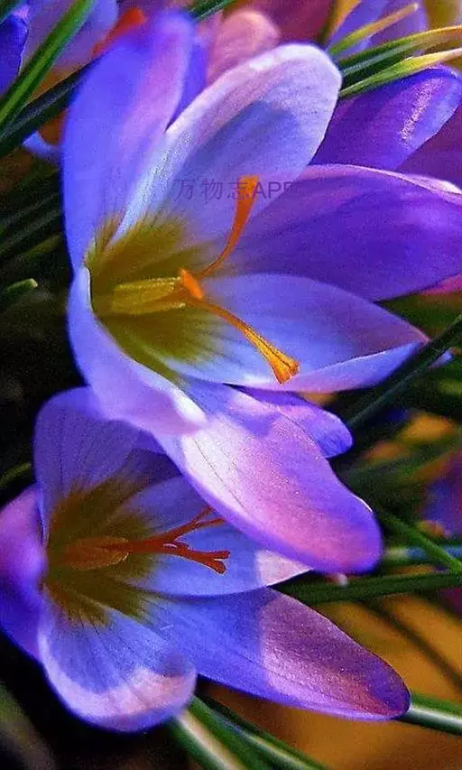 番红花是多年生草本植物。球茎扁圆球形,直径约3厘米,外有黄褐色的膜质包被。叶基生,9-15枚,条形,灰绿色,长15-20 厘米,宽2-3毫米,边缘反卷;叶丛基部包有4-5片膜质的鞘状叶。