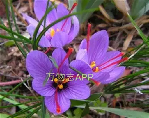 番红花(学名:Crocus sativus L.)又称藏红花、西红花,是一种鸢尾科番红花属的多年生花卉,也是一种常见的香料。多年生草本。球茎扁圆球形,直径约3厘米,外有黄褐色的膜质包被。叶基生,9-15枚,条形,灰绿色,边缘反卷;叶丛基部包有4-5片膜质的鞘状叶。花茎甚短,不伸出地面;花1-2朵,淡蓝色、红紫色或白色,有香味,花柱橙红色,柱头略扁,顶端楔形,有浅齿,子房狭纺锤形。蒴果椭圆形,长约3厘米。