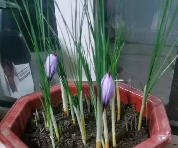 番红花室内和大田的花期均在10月中旬至11月上旬,以每天9-11点开花最盛,花朵色泽鲜艳。室内不受天气影响,可全天采花;室外花朵在开的第1天8-11时采摘,采晚了柱头易沾上雄蕊花粉影响质量。采后剥开花瓣,取出雌蕊花柱和柱头,以三根连着为佳。摊于白纸上置通风处阴干,量大可用烤箱烘干,避光密闭贮藏待售。一般80朵花可加工1克干花,1亩可收干花1-2千克。