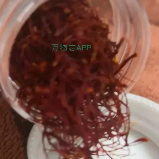 完整的柱头呈线形,先端较宽大,向下渐细呈尾状,先端边缘具不整齐的齿状,下端为残留的黄色花枝。长约2.5厘米,直径约1.5毫米。紫红色或暗红棕色,微有光泽。体轻,质松软,干燥后质脆易断。将柱头投入水中则膨胀,可见橙黄色成直线下降,并逐渐扩散,水被染成黄色.无沉淀柱头呈喇叭状,有短缝。在短时间内用针拨之不破碎。气特异,微有刺激性,味微苦。以身长,色紫红,滋润而有光泽,黄色花柱少,味辛凉者为佳。