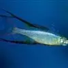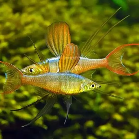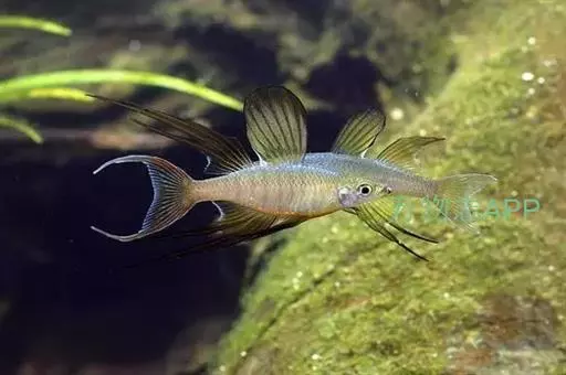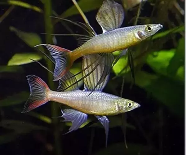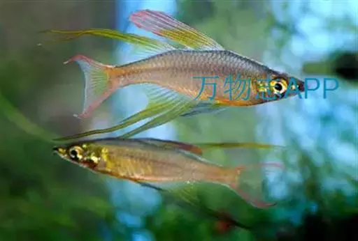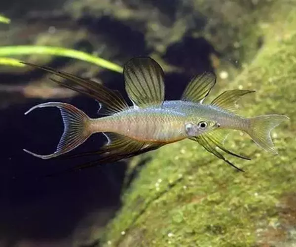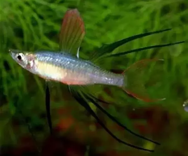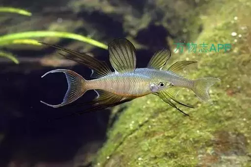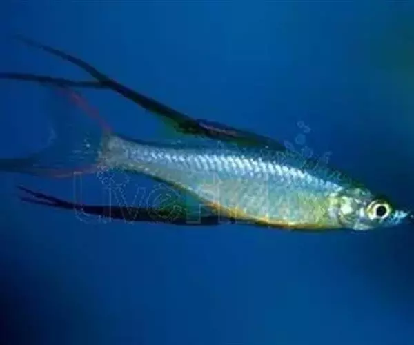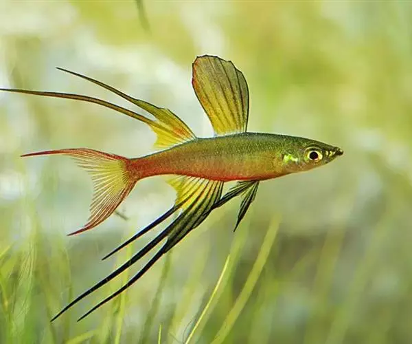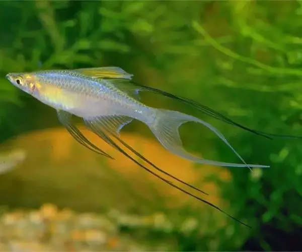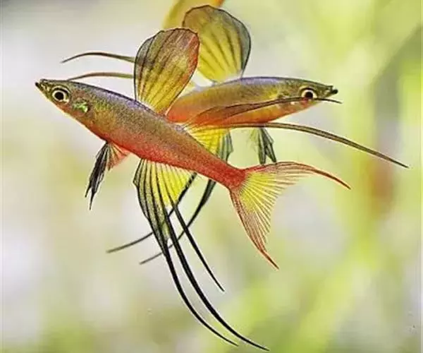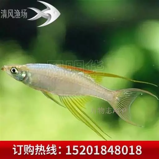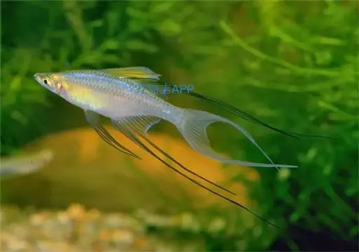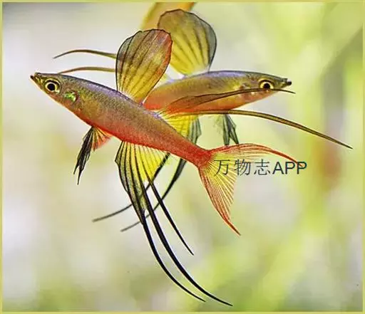 身体为尖梭形,腹部圆,尾柄长。体背部青色,腹部金黄色,体侧中央从眼晴到尾柄方向一条金黄色带。背 鳍挺拔修长,鳍条末梢尖长,向后廷伸起过尾鳍。腹鳍变异为两根长长的尖鳍,形似燕子。