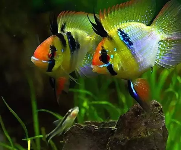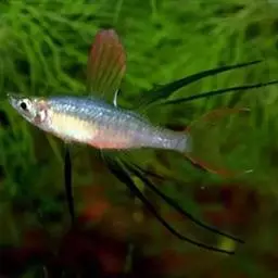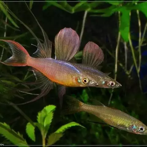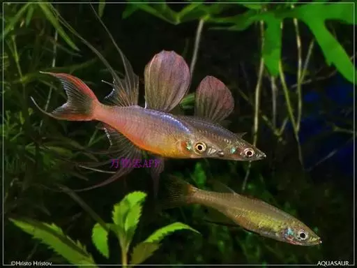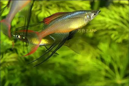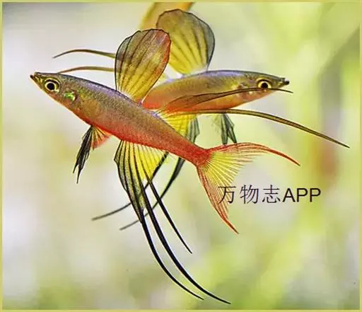 伊岛银汉鱼的腹鳍变异为两根长长的尖鳍,形似燕子,故名“燕子美人”。当然它们引人注目的地方除了纤长的腹鳍外,还有精心饲养后展现的美丽体色。