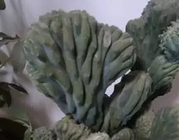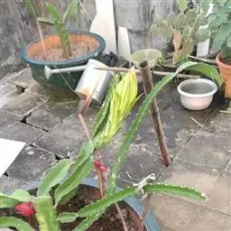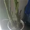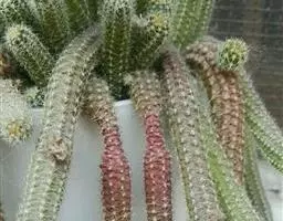 直立茎高2~4m,主茎粗5~1Ocm,茎节上有规律地交又排列着长圆形瘤突。细圆柱形肉质叶着生于茎节上部,1Ocm长,通常宿存,可存在3~4年,除非特别干旱和生长不良,一般不会全部脱落。刺座有少许黄色钩毛和1~2根淡黄色的刺,刺长8cm。夏日开红花,花径2cm。
