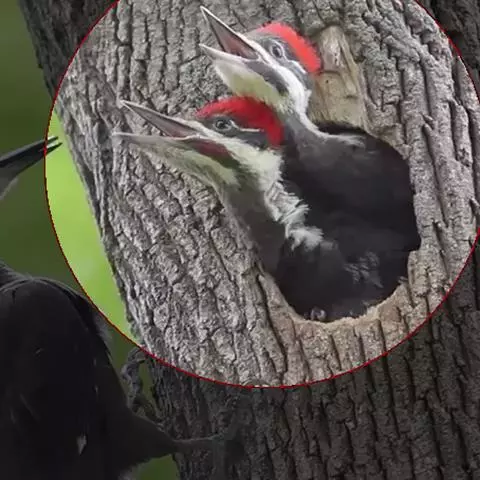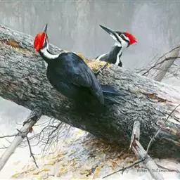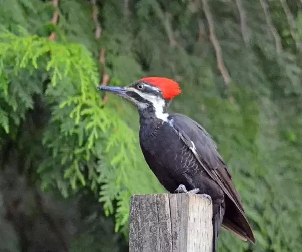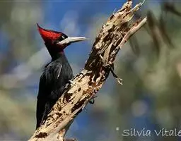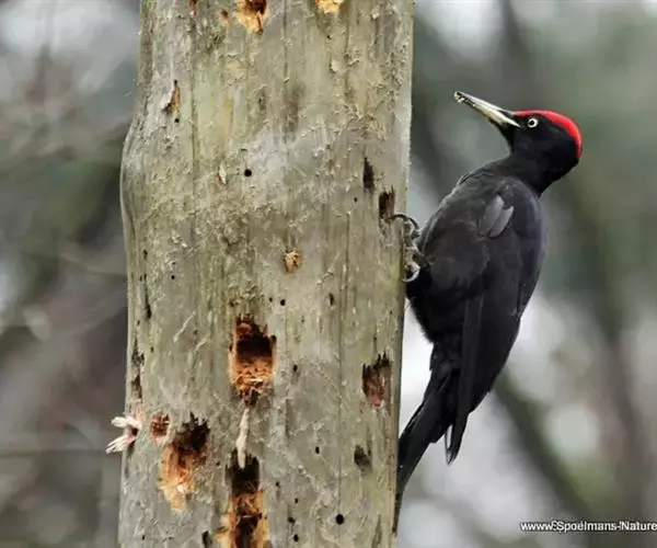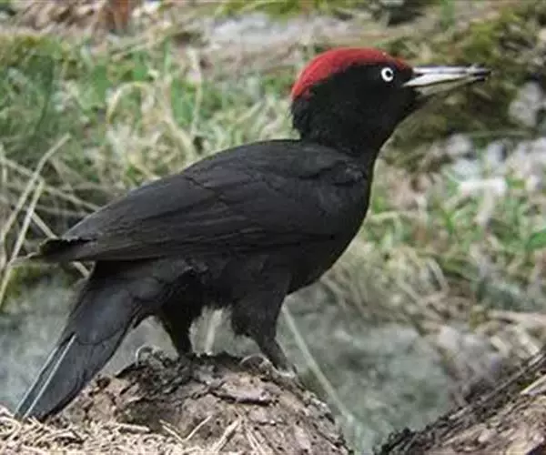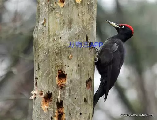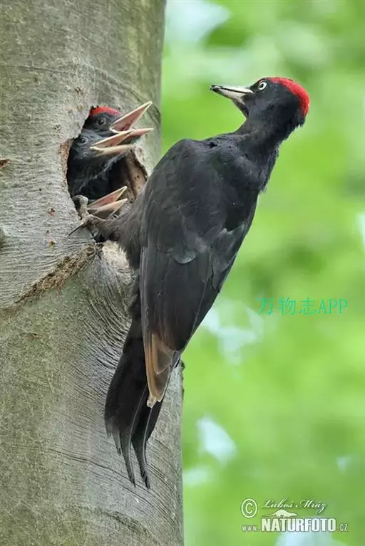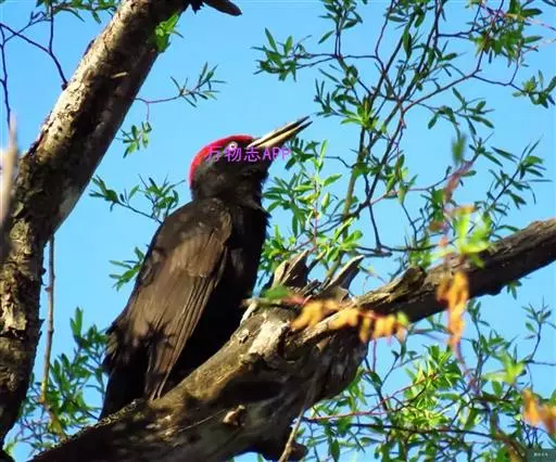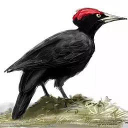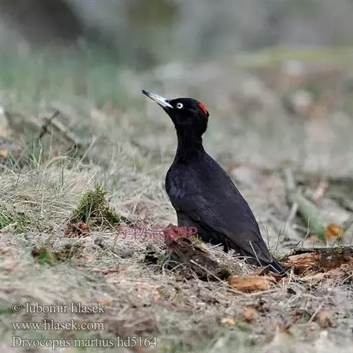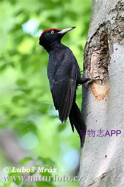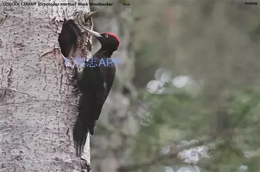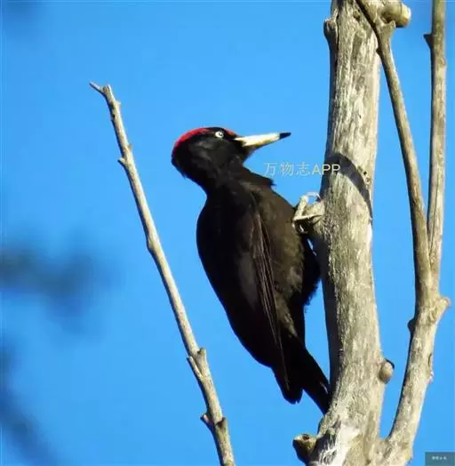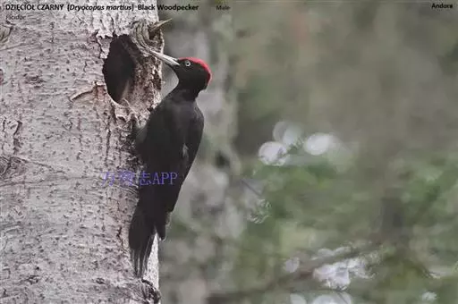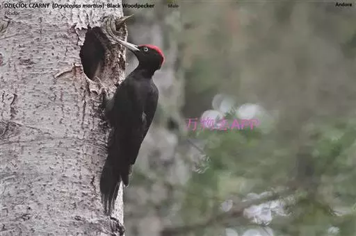 黑啄木鸟(学名:Dryocopus martius)属鴷形目、啄木鸟科,是一种大型的啄木鸟,体长45-47厘米,翼展64-68厘米,体重300-350克,寿命11年。是啄木鸟中最大的一种。通体几纯黑色;雄鸟额、头顶和枕全为血红色;雌鸟仅后头有血红色。