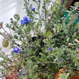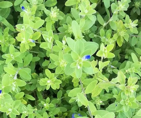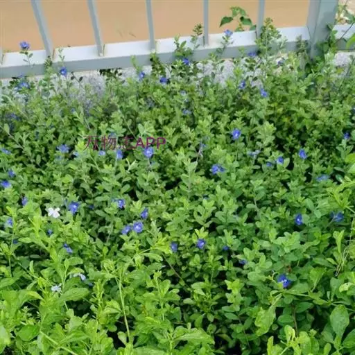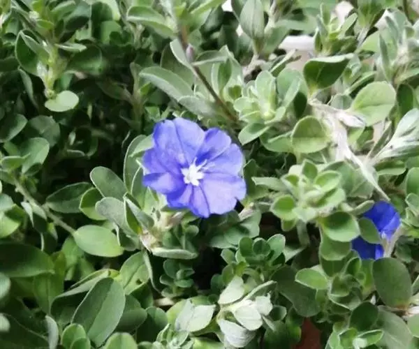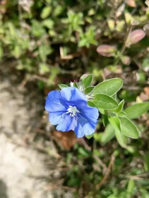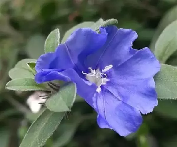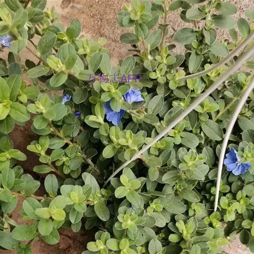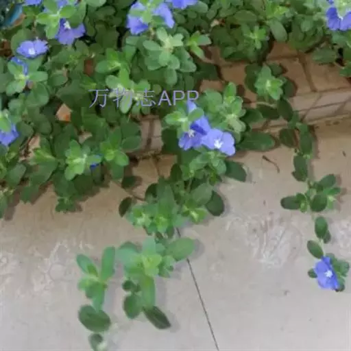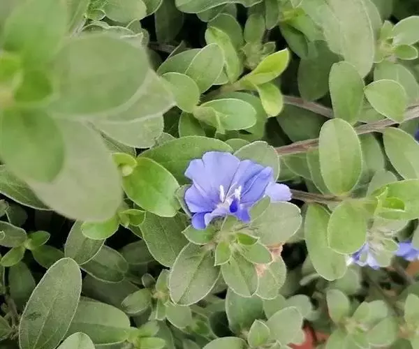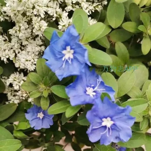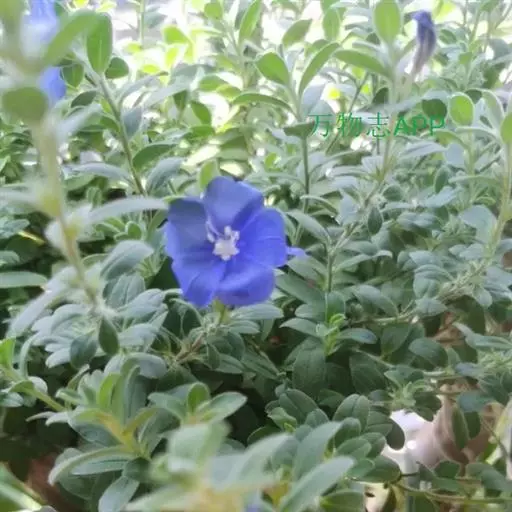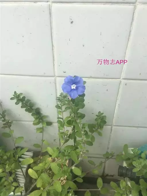 叶: 叶互生,长椭圆形,全缘,叶背密被白毛。 茎:株高30~60公分。茎半蔓性,密被白毛。 花:花为腋生,合瓣花,花冠五裂蓝色,中心白星形。全年均能开花。