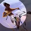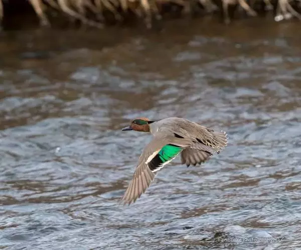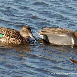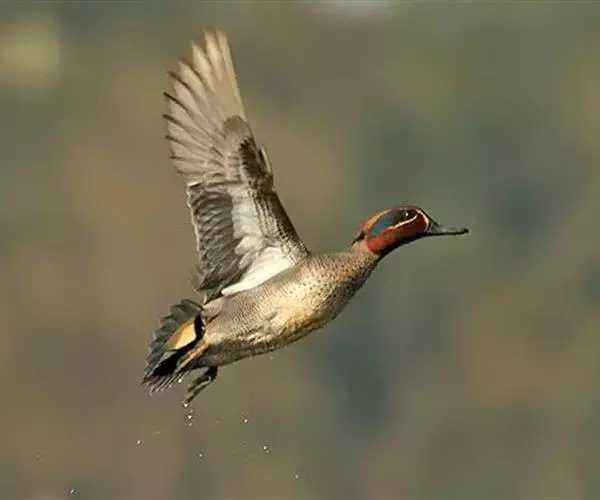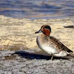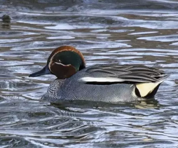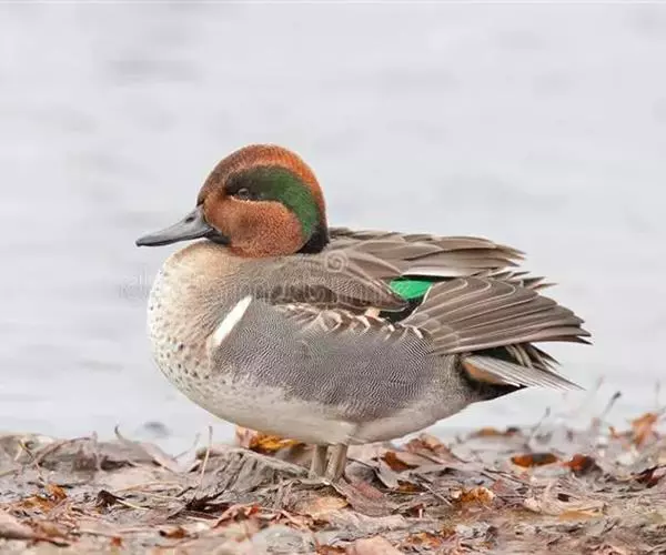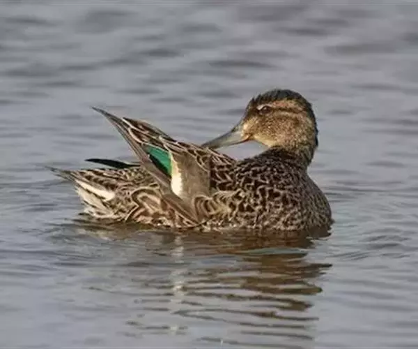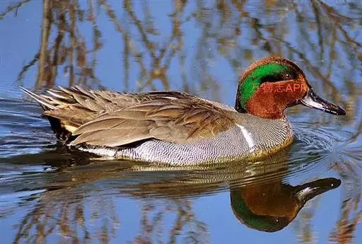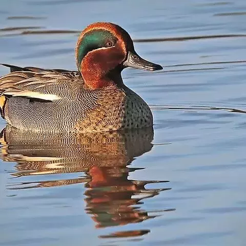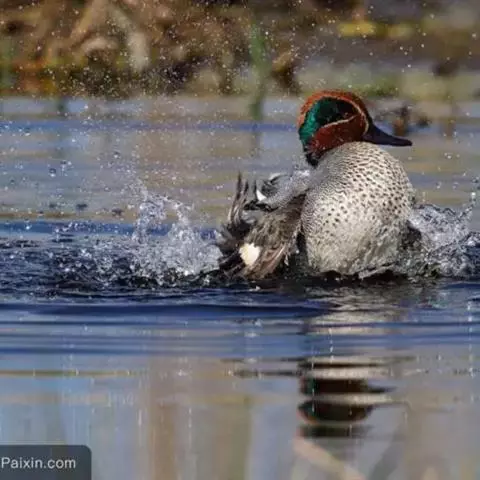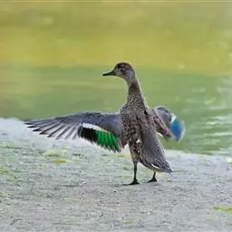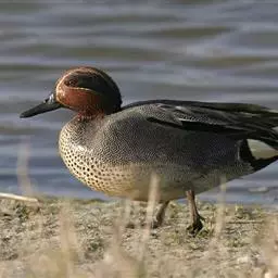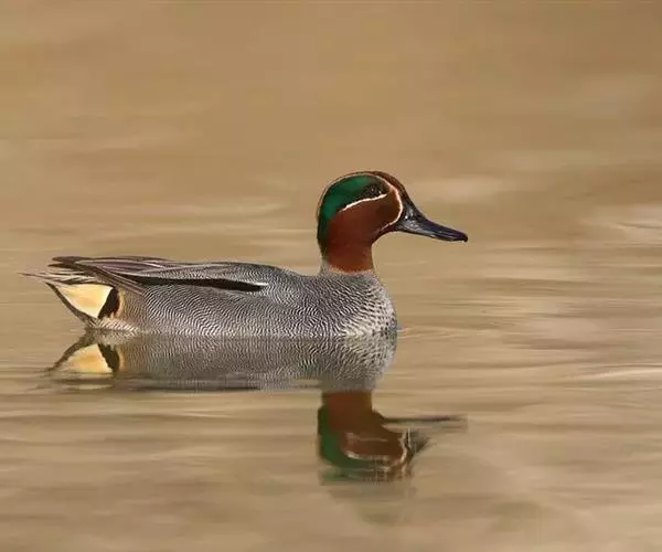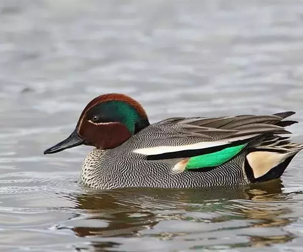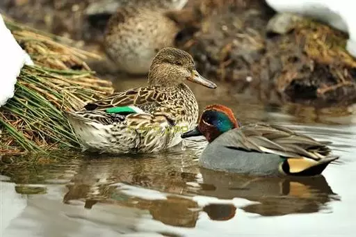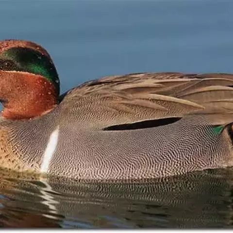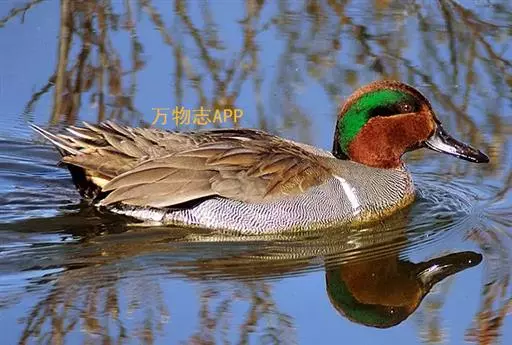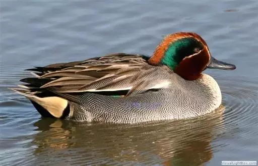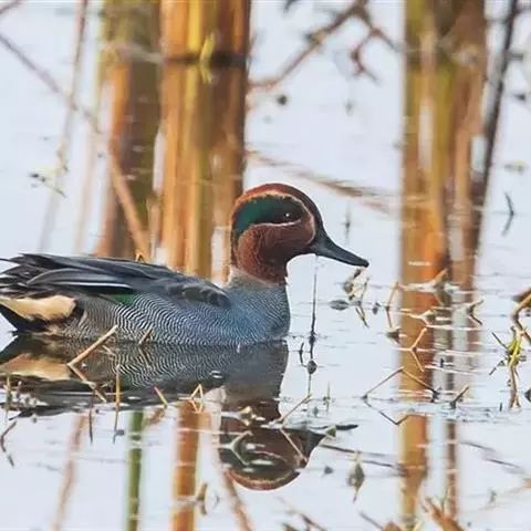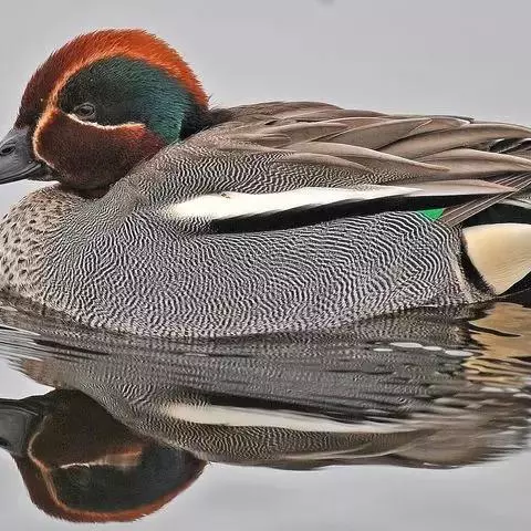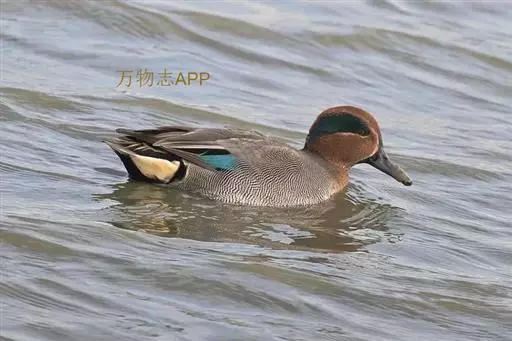 绿翅鸭(学名:Anas crecca)是小型鸭类,体长37厘米,体重约0.5千克。嘴脚均为黑色。雄鸟头至颈部深栗色,头顶两侧从眼开始有一条宽阔的绿色带斑一直延伸至颈侧,尾下覆羽黑色,两侧各有一黄色三角形斑,在水中游泳时,极为醒目。飞翔时,雌雄鸭翅上具有金属光泽的翠绿色翼镜和翼镜前后缘的白边,亦非常醒目。跗鳞盾片状;雄体气管有不对称的膨大部;两者鸣声不同,通常羽衣及行为亦异;配偶关系及家庭生活维持时间短;一年换羽2次;雄体常换“蚀羽”及鲜艳的婚羽各1次;幼雏的绒羽有明显花纹;雌体有“逗引”表演。广泛分布于美洲、欧洲、亚洲和非洲等地。