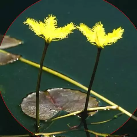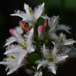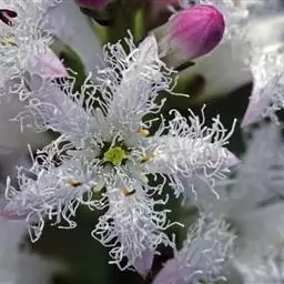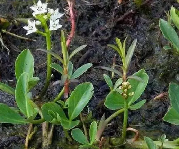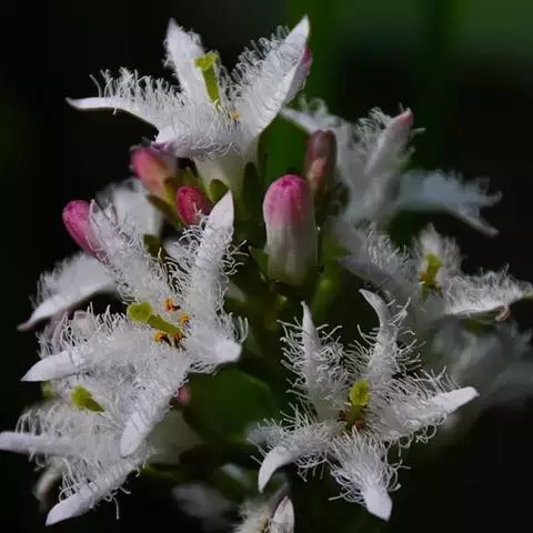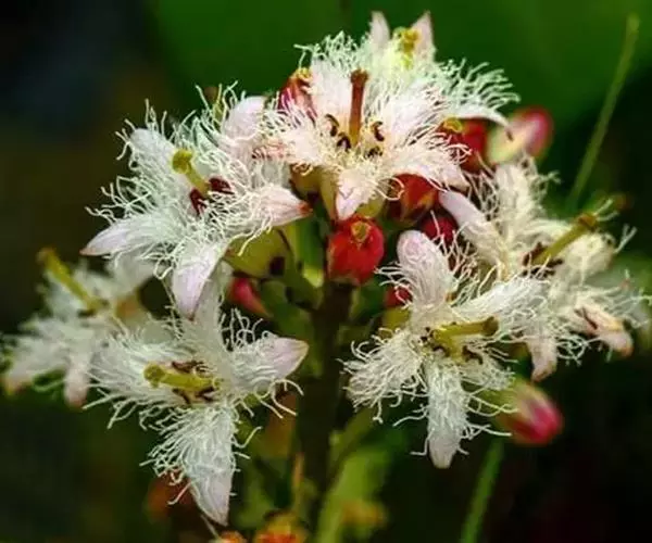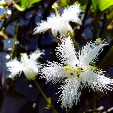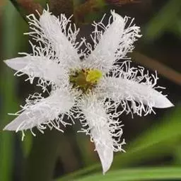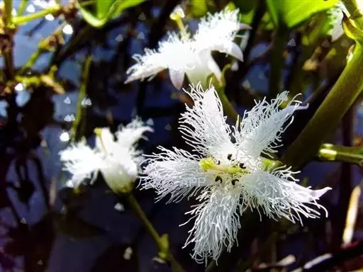 睡菜(学名:Menyanthes trifoliata L.)整株挺水植物,全株光滑无毛。根状茎匍匐状,叶基生,三出复叶、椭圆形,总柄长23-30厘米,全缘状微波形。总状花序顶生,基部生一披针形苞叶。小花具柄,直径1-2厘米;花冠5深裂,白色,有纤毛;雄蕊5枚,红色;子房上位,蒴果球形。花期5-7月,果期6-8月。