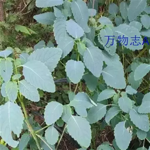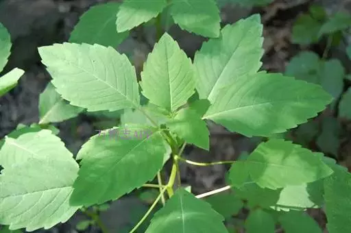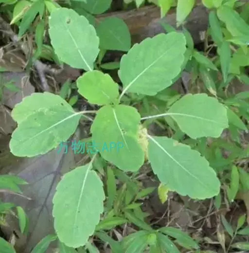 叶互生;叶片卵形或卵状椭圆形,长3-8厘米,宽1.5-4厘米,先端钝,稀急尖,基部圆钝或宽楔形,边缘有粗圆齿状齿,齿端具小尖,两面无毛,上面深绿色,下面灰绿色;叶柄纤细,长2-5厘米。最上部的叶柄更短或近无柄。