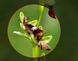 总花梗长1-1.5厘米,具2-4花,排列成总状花序;花梗长1.5-2毫米,中上部有1枚苞片;苞片草质,披针形,长3-5毫米,宿存;花黄色;侧生2萼片卵形或宽卵形,长5-6毫米,先端急尖;旗瓣圆形或近圆形,直径约10毫米,先端微凹,背面中肋具绿色鸡冠状突起,顶端具短喙尖;翼瓣无柄,长20-25毫米,2裂,下部裂片小,长圆形,上部裂片宽斧形,近基部散生橙红色斑点,外缘近基部具钝角状的小耳;唇瓣宽漏斗状,喉部散生橙红色斑点,基部渐狭成长10-15毫米内弯的距。雄蕊5,花丝线形,上部稍膨大,花药卵球形,顶端尖;子房纺锤形,直立,具短喙尖。