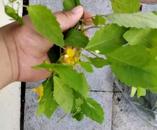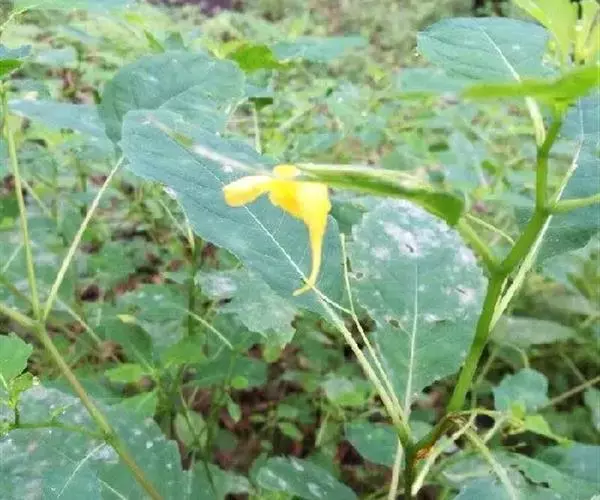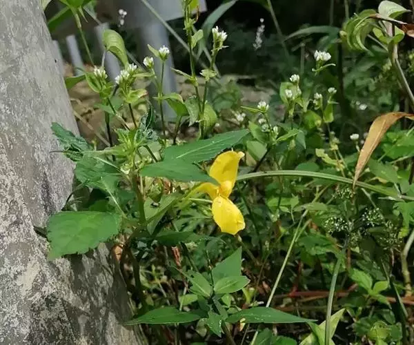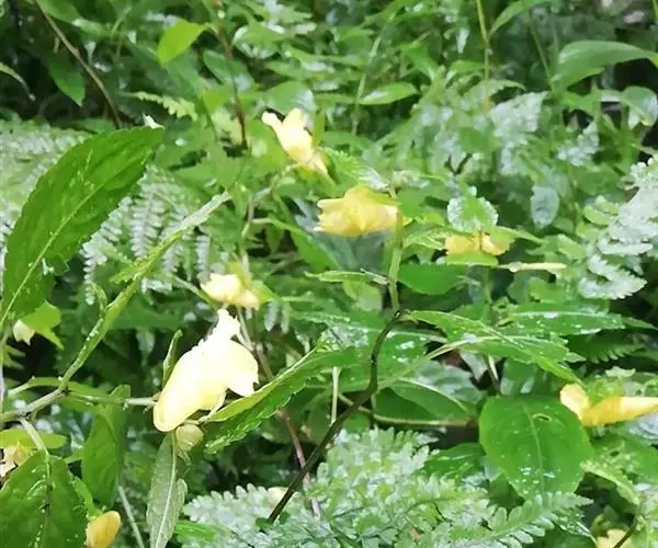 水金凤(学名:Impatiens noli-tangere Linn.):是凤仙花科,凤仙花属一年生草本植物,高可达70厘米。茎肉质,直立,叶互生;叶片卵形或卵状椭圆形,边缘有粗圆齿状齿,上面深绿色,下面灰绿色;叶柄纤细,总状花序;苞片草质,披针形,花黄色;侧生萼片卵形或宽卵形,旗瓣圆形或近圆形,翼瓣无柄,唇瓣宽漏斗状,花丝线形,花药卵球形,顶端尖;子房纺锤形,蒴果线状圆柱形,种子多数,7-9月开花。