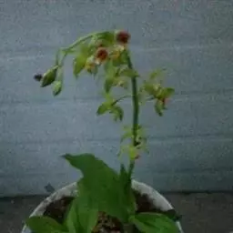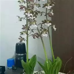 花葶出自假茎上端的叶丛间,长达70厘米,高出叶层之外,密被短毛;花序柄常具1枚鳞片状的鞘;鞘宽卵形,长约6毫米,先端渐尖,无毛;总状花序长达32厘米,疏生多数花,无毛;花梗白色,连同绿色的子房长15-20毫米,弧形弯曲,密被短毛;花张开;萼片和花瓣在背面褐色,内面淡黄色;中萼片近椭圆形,长10-15毫米,宽5-6毫米,先端锐尖,基部收狭,具(3-)4-5条脉,无毛或背面疏被短毛;侧萼片近似于中萼片,但稍狭。
