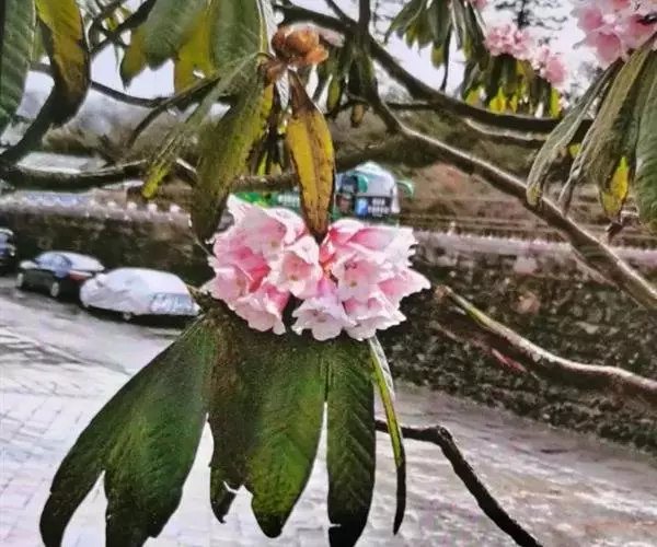 美容杜鹃(学名:Rhododendron calophytum Franch):常绿灌木或小乔木,高2-12米;树皮黄灰色或棕褐色,片状剥落;幼枝粗壮,绿色或带紫色。冬芽顶生,阔卵圆形。叶厚革质,长圆状倒披针形或长圆状披针形,上面亮绿色,下面淡绿色。顶生短总状伞形花序,有花15-30朵;花冠阔钟形,长4-5厘米,直径4-5.8厘米,红色或粉红色至白色,基部略膨大,内面基部上方有1枚紫红色斑块。蒴果斜生果梗上,长圆柱形至长圆状椭圆形。花期4-5月,果期9-10月。