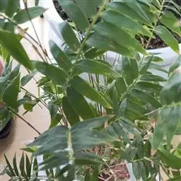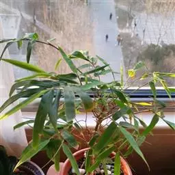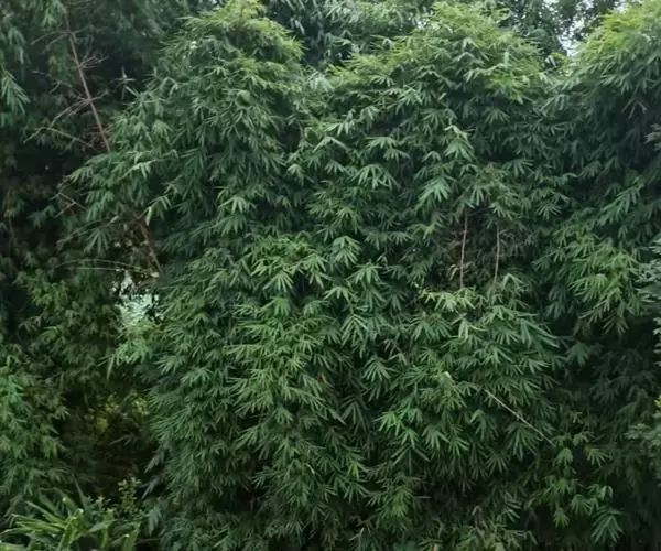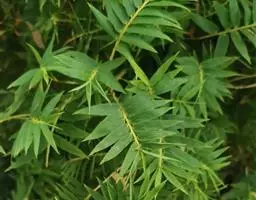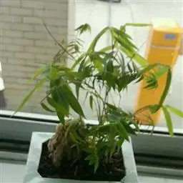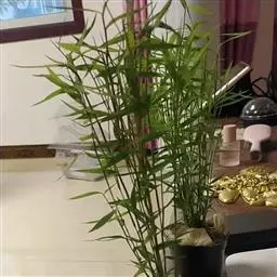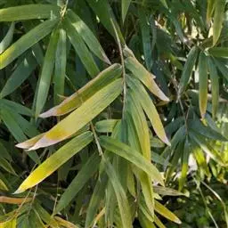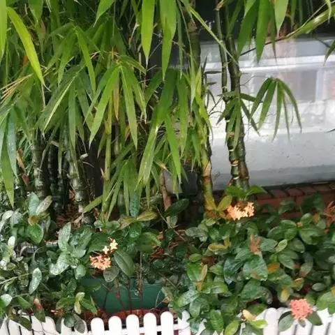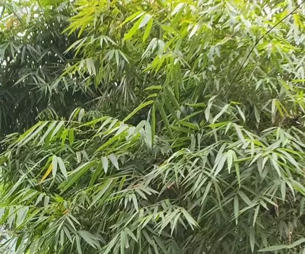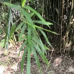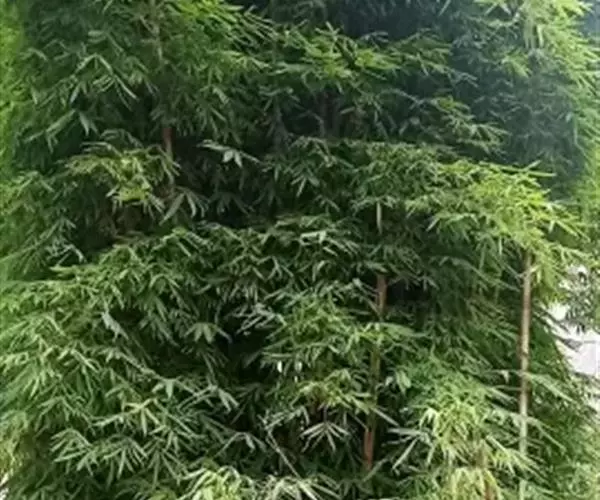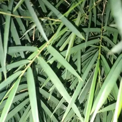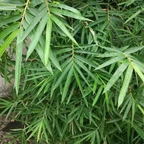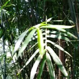 凤尾竹 Raeusch. ex Schult. ’Fernleaf’ R. A. Young)是禾本科,簕竹属孝顺竹的变种。植株较高大,杆高可达6米,竿中空,小枝稍下弯,下部挺直,绿色;竿壁稍薄;节处稍隆起,无毛;叶鞘无毛,纵肋稍隆起,背部具脊;叶耳肾形,边缘具波曲状细长繸毛;叶舌圆拱形,叶片线形,上表面无毛,下表面粉绿而密被短柔毛,小穗含小花,中间小花为两性;外稃两侧稍不对称,长圆状披针形,先端急尖;内稃线形,脊上被短纤毛,花药紫色,子房卵球形,羽毛状。成熟颖果未见。原产中国,华东、华南、西南以至台湾、香港均有栽培。凤尾竹喜温暖、湿润和阳光充足的环境,耐寒。宜土层深厚、肥沃、疏松的微酸性壤土。该种观赏价值较高,宜作庭院丛栽,也可作盆景植物。全草或根入药,味淡、微苦,性寒,有清热利湿、凉血止血、消肿解毒功效,可治痢疾、泄泻等多种病症。凤尾