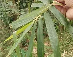 末级小枝具数叶乃至多叶;叶鞘长4-8厘米,无毛,具纵肋,无鞘口繸毛;叶舌截形,棕黑色,高1-1.5毫米,上缘啮蚀状细裂;叶片窄披针形,大都长10-30厘米,宽1-3厘米,质薄,先端渐细尖,基部圆形或楔形,上表面无毛,下表面被细柔毛,次脉5-10对,小横脉不存在,叶缘通常粗糙;叶柄长2-3毫米。花枝束生,常甚柔。弯曲下垂,长20-60厘米或更长,节间长1.5-5.5厘米;假小穗长达1.5厘米;小穗轴无毛,粗扁,上部节间长约2毫米;颖0-1,长约6-7毫米;外稃宽卵形,长8-10毫米,具多脉,顶端具小尖头,边缘生纤毛;内稃长7-9毫米,背部2脊上生纤毛,脊间无毛;鳞被3,有时4,形状有变化,一般呈长圆兼披针形,前方的2片长2-3毫米,有时其先端可叉裂,后方1片长3-4毫米,均于边缘生纤毛;雄蕊6,有时可具不发育者而数少,花丝长4-7毫米,花药长4-6毫米,顶端生小刺毛或其毛不明显;子房长1毫米,花柱长4毫米或更短,具微毛,向上呈各式的分裂而成为2-4枚柱头,后者长为3-5毫米(彼此间长短不齐),羽毛状。