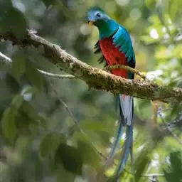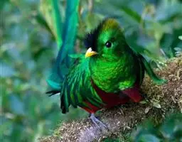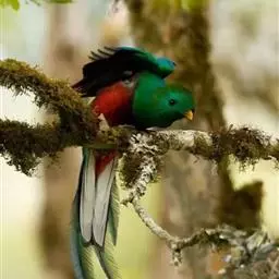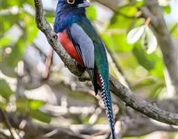 橙胸咬鹃:全长约28厘米。雄鸟头、颈橄榄绿色,上体及中央尾羽栗色;中央尾羽具黑色端,…