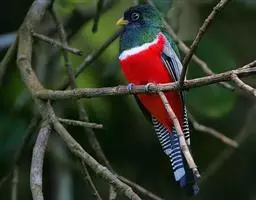 红头咬鹃(学名:Harpactes erythrocephalus): 体大,体长约33厘米,体重75-110克。头、颈暗绯红色;背、肩锈褐色。两翅黑色,翅上覆羽和内侧飞羽密被白色细虫蠹斑纹,初级飞羽黑色,外侧具白色羽缘;腰和尾上覆羽较多锈色。中央尾羽深栗色,具黑色羽干纹和端斑。雄鸟以红色的头部为特征,背部颈圈缺失,红色的胸部上具狭窄的半月形白环;雌鸟与其他雌咬鹃区别在腹部红色,胸部具半月形白环;而与所有雄咬鹃的区别在头黄褐色。虹膜褐色;眼周裸皮蓝色;嘴近蓝色;脚偏粉色。