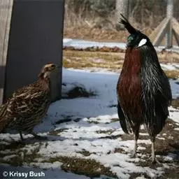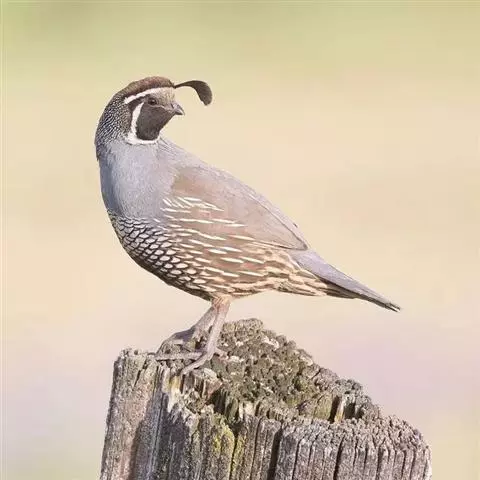 雌鸟:羽色与鹌鹑近似。头顶黑褐色,但范围窄,羽缘黄褐;头顶中央贯以浅黄色纵纹。上背暗棕褐色,具白色羽干纹,羽端具黑斑;下背、肩、腰和尾上覆羽均黑褐色,杂以浅棕褐色横斑,并具宽阔的浅黄色羽干纹。翅上内侧覆羽大都棕褐,杂以黑色横斑,外侧覆羽和飞羽暗褐无斑,最外侧初级飞羽狭缘以白色。头和颈的内侧黄褐;颏及喉的上部白色,杂以黄褐色,喉的下部浅黄褐色;胸部和两胁黄褐色,具黑褐色细横斑,这与鹌鹑具黑褐色纵纹的情况显然有别。腹淡黄色;围肛羽白色微黄,羽基暗灰褐色;尾下覆羽黄褐色,具黑褐色横斑。