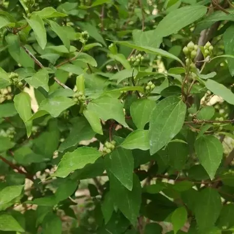 灌木,高1.5-3.5米;二年生小枝灰褐色,表皮呈片状脱落,当年生小枝浅褐色或紫红色,被微柔毛或有时无毛。叶卵形或阔卵形,长6-12.5厘米,宽8-10厘米,先端急尖,基部圆形,花枝上叶较小,卵形、椭圆形至卵状披针形,长4-8.5厘米,宽3.5-6厘米,先端渐尖,基部阔楔形或近圆形,边缘具疏锯齿,上面被刚毛,下面密被白色长粗毛,叶脉离基出3-5条;叶柄长5-10毫米。