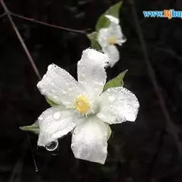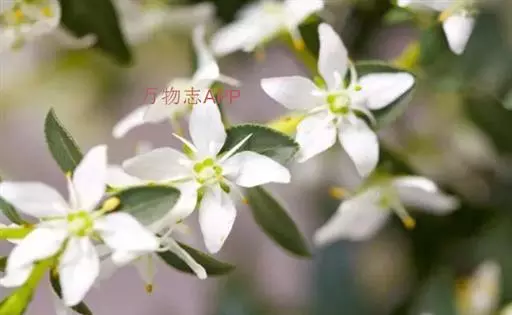 总状花序有花5-7(-11)朵,下部的分枝有时具叶;花序轴长5-7厘米,疏被长柔毛或无毛;花梗长5-10毫米,上部密被白色长柔毛;花萼外面密被紧贴糙伏毛;萼筒钟形,裂片卵形,长约5毫米,宽约3.5毫米,先端骤渐尖;花冠盘状,直径2.5-3厘米,花瓣白色,卵形或近圆形,基部急收狭,长13-15毫米,宽8-13毫米;雄蕊30-35,最长的长达10毫米;花盘无毛;花柱长约5毫米,无毛,近先端稍分裂,柱头棒形,长约1.5毫米,较花药小。