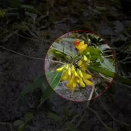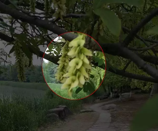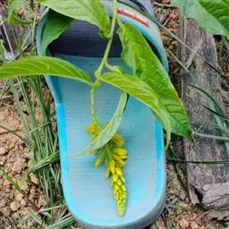 总状花序顶生或腋生,长10-15厘米,直立,花后延长达30厘米,下垂,被短柔毛;花梗基部具线状长圆形小苞片,早落;萼片5,早落,具缘毛,外面3枚小,不等大,上面1枚盔状,长6-7毫米,其余2枚卵形至椭圆形,长3毫米,里面2枚大,花瓣状,斜倒卵形,长1.5厘米,宽7-8毫米,先端圆形,基部渐狭;花瓣正黄色,3枚,侧生花瓣长圆形,长约10毫米,2/3以上与龙骨瓣合生,先端几截形,基部向上盔状延长,内侧无毛,龙骨瓣盔状,长约12毫米,鸡冠状附属物具柄,流苏状,长约3毫米;雄蕊8,长10-11毫米,花丝2/3以下连合成鞘,花药卵形;子房圆形,压扁,径3-4毫米,具缘毛,基部具环状花盘,花柱细,长8-9毫米,先端略呈2浅裂的喇叭形,柱头具短柄。