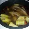 5煮面筋:锅中倒入清水煮沸,将洗好之面筋揪成条状缠成比拇指稍粗的棒棒多个后放入锅中煮45分钟熟,用漏勺拎干水捞出后,撕成较小条片状放盘中备用。