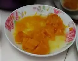 3洗五六遍左右,直到水不再浑浊,剩下那一下块黄黄的东东就面筋啦,在面筋里加点发酵粉抓匀,上蒸屉,足气蒸20分钟,晾凉后切片(也可以不蒸,用油炸下,然后炒着吃,味道也不错)。