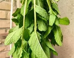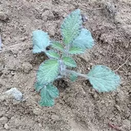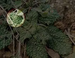 叶对生长椭圆形,长3-5cm,灰绿色,叶表有凹凸状织纹,且有折皱,灰白色,香味刺鼻浓郁。