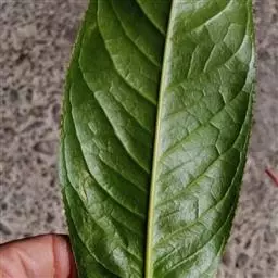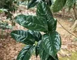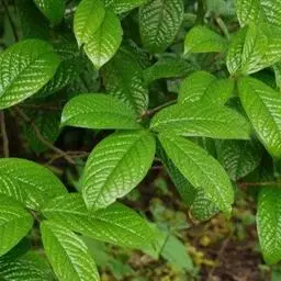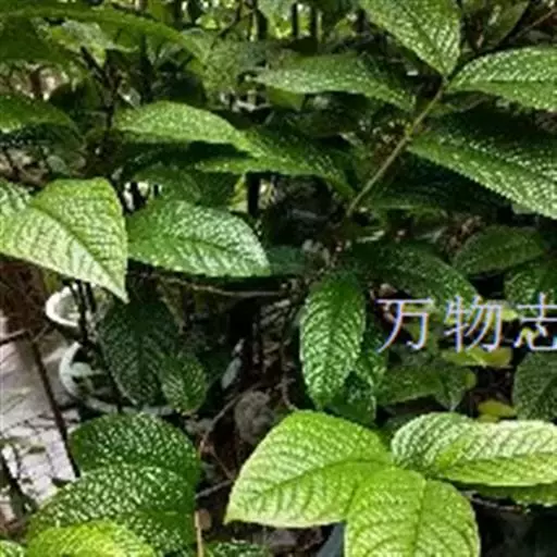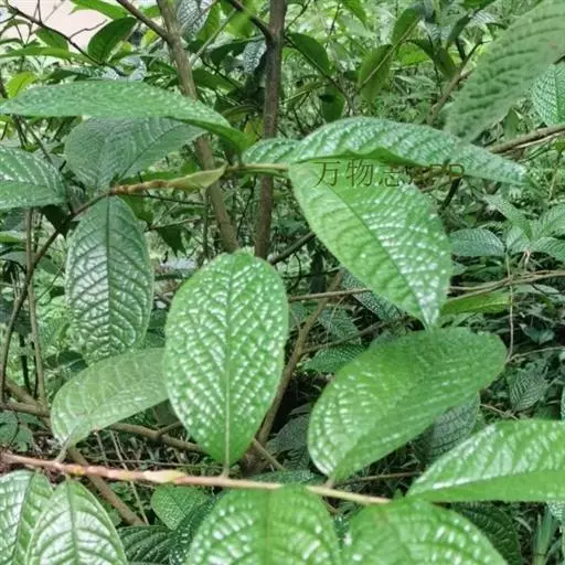 灌木,高3米,嫩枝有短粗毛,老枝变秃。叶革质,椭圆形,长12-22厘米,宽5.5-8.5厘米,先端急尖,基部阔楔形或窄而圆,上面深绿色,干后橄榄绿色,有光泽,下面黄褐色,被柔毛,至少在中脉及侧脉上有毛,有黑腺点,侧脉10-14对,与中脉在上面凹下,在下面强烈突起,边缘有细锯齿,齿刻相隔2-3毫米,叶柄长1厘米,上面有沟,无毛,下面有毛。