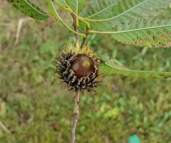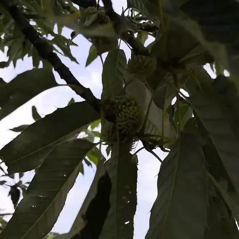 坚果卵形或椭圆形,直径1.5-2厘米,高1.7-2.2厘米,顶端圆形,果脐突起。花期3-4月,果期当年9-10月。