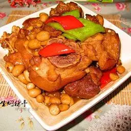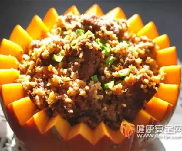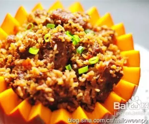 原料:南瓜1 个,五花猪肉400 克,黄酒、酱油、红糖、老汤、葱、姜、花椒粉、食用油、味精适量。