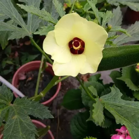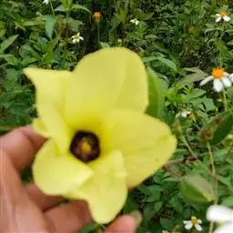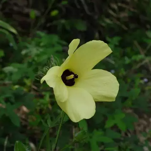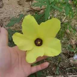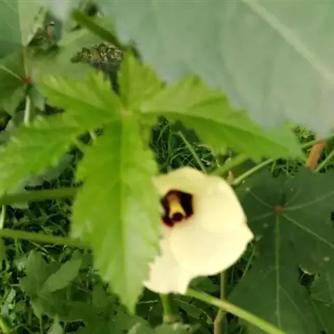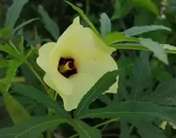 咖啡黄葵(学名:Abelmoschus esculentus (Linn.)Moench)亦称黄秋葵,锦葵科一年生草本植物。茎圆柱形,疏生散刺。叶掌状,裂片阔至狭,托叶线形,被疏硬毛。花单生于叶腋间,花梗疏被糙硬毛,小苞片钟形;花萼钟形,密被星状短绒毛;花黄色,内面基部紫色,蒴果筒状尖塔形,种子球形,具毛脉纹。花期5-9月。