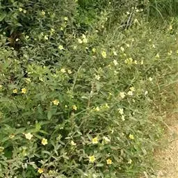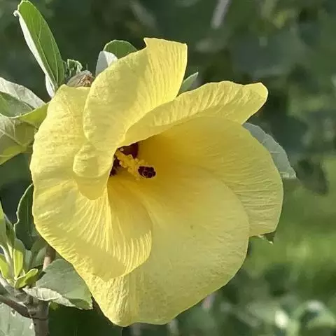 花单生于叶腋间,花梗长1-2厘米,疏被糙硬毛;小苞片8-10,线形,长约1.5厘米,疏被硬毛;花萼钟形,较长于小苞片,密被星状短绒毛;花黄色,内面基部紫色,直径5-7厘米,花瓣倒卵形,长4-5厘米。