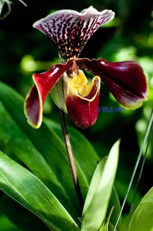 紫毛兜兰 地生或附生植物。叶基生,二列,通常4-5枚;叶片宽线形或狭长圆形,长20-40厘米,宽2.5-4厘米,先端常为不等的2尖裂,深黄绿色,背面近基部有紫色细斑点,无毛,基部收狭成叶柄状并对折而互相套叠。