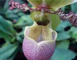 飘带兜兰 Stein)是兰科兜兰属的附生植物,叶基生,叶片宽带形,厚革质,无毛;花葶近直立,绿色,…