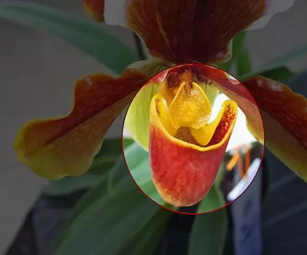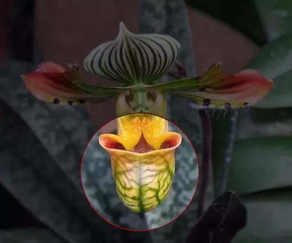花葶直立,长10-24厘米,黄绿色,有紫色斑点和较密的长柔毛,顶端生1花;花苞片近椭圆形,长4-5厘米,宽2-2.5厘米,围抱子房,除背面中脉近基部处具长柔毛外余均无毛;花梗和子房长4-5厘米,密被紫褐色长柔毛;花大;中萼片中央紫栗色而有白色或黄绿色边缘,合萼片淡黄绿色,花瓣具紫褐色中脉,中脉的一侧(上侧)为淡紫褐色,另一侧(下侧)色较淡或呈淡黄褐色,唇瓣亮褐黄色而略有暗色脉纹;中萼片倒卵形至宽倒卵状椭圆形,长4.5-6厘米,宽3-3.8厘米,先端钝,基部收狭,边缘具缘毛,基部边缘向后弯卷;合萼片卵形,长3.8-5厘米,宽1.7-2.2厘米,亦具类似的缘毛;花瓣倒卵状匙形,长5-6.5厘米,上部宽2.5-2.8厘米,先端钝,边缘波状并有缘毛,基部明显收狭成爪并在内表面有少量紫褐色长柔毛;唇瓣倒盔状,基部有宽阔的,长2-2.5厘米的柄;囊近椭圆状圆锥形,长2.5-3.2厘米,宽2-3厘米,囊口极宽阔,两侧各有1个直立的耳,两耳前方边缘不内折,囊底有毛;退化雄蕊椭圆状倒卵形,长1-1.5厘米,宽7-10毫米,先端近截形而略有凹缺,基部有耳,中央具脐状突起,脐状突起上有时具不明显的小疣。花期11月至次年3月。