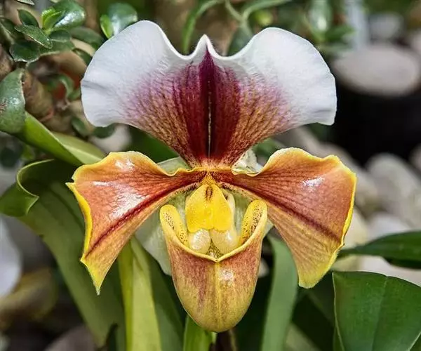 兜兰又名拖鞋兰,夏秋或临冬开花,花期最长达70余天。西南地区的兜兰叶片通常要厚实硬朗些,花色更为亮丽显眼,有更好的抗旱保水机制,在抗逆性新品种选育上具有非常高的利用价值。