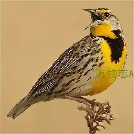 西美草地鹨 西美草地鹨体长19-26cm,翼展35-40cm,体重90-150g。黑帽,白眉,眼睛前端有一块黄色大斑,黑眼睛。体羽以黑色为主,带有醒目的黄色斑;上体和翅膀具黑褐色条纹,颈部和下颌黄色,胸部鲜黄色,在颈部和胸部之间有一道很宽的V形黑纹。侧面的条纹较暗。尾羽外侧白色。鸟喙嘴蓝灰色。雌鸟常为褐色。