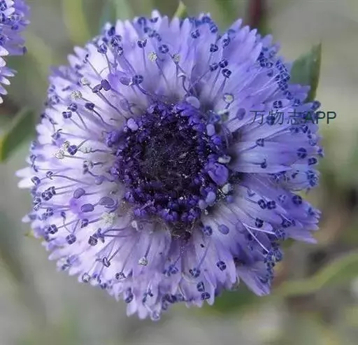 复头状花序单生茎枝顶端,直径4-5.5厘米。头状花序长2厘米。基毛长1厘米,为总苞长度之半,白色,扁毛状,不等长。外层苞片稍长于基毛,长倒披针形,上部椭圆形扩大,褐色,外面被稍稠密的短糙毛及腺点,边缘有稍长的缘毛,顶端针芒状长渐尖,爪部下部有长达4 毫米的长缘毛;中层苞片倒披针形或长椭圆形,长约1.1厘米,边缘有长缘毛,外面有稠密的短糙毛;内层披针形,长8毫米,外面被稠密的短糙毛,顶端芒齿裂或芒片裂,中间芒裂较长。全部苞片14-18个。小花淡蓝色或白色,花冠5深裂,裂片线形,花冠管无腺点或有稀疏腺点。瘦果倒圆锥状,长约7毫米,被黄色的稠密顺向贴伏的长直毛,不遮盖冠毛。冠毛量杯状,高约1.2毫米;冠毛膜片线形,边缘糙毛状,大部结合。花果期8-9月。