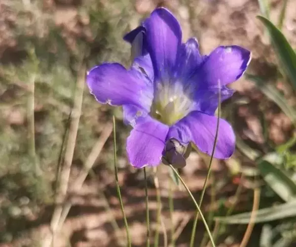 聚伞花序顶生及腋生,排列成疏松的花序;花梗斜伸,黄绿色或紫红色,极不等长,总花梗长至5.5厘米,小花梗长至3厘米;花萼筒膜质,黄绿色或带紫红色,筒形,长7-10毫米,不裂,稀一侧浅裂,裂片5个,不整齐,线形,绿色,长3-8毫米,先端渐尖,边缘粗糙,背面脉不明显,弯缺宽,圆形或截形;花冠深蓝色,有时喉部具多数黄色斑点,筒形或漏斗形,长3.5-4.5厘米,裂片卵形或卵状椭圆形,长5-7毫米,先端钝,全缘,褶整齐,三角形或卵形,长1.5-2-毫米,先端钝,全缘或边缘啮蚀形;雄蕊着生于冠筒中下部,整齐,花丝线状钻形,长1-1.2厘米,花药矩圆形,长2-3毫米;子房无柄,披针形或线形,长18-23毫米,先端渐尖,花柱线形,连柱头长2-4毫米,柱头2裂。蒴果内藏,无柄,狭椭圆形,长2.5-3厘米;种子淡褐色,有光泽,矩圆形,长1.3-1.5毫米,表面有细网纹。花果期7-9月。