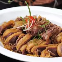 雏母鸡1只(重1000 g左右),开膛洗净后剁成5 cm见方的块。杏仁100 g用温水泡透,去掉外皮。将鸡块下入热花生油(500 g,实耗75 g)中炸呈金黄色。