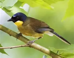 黄喉噪鹛体型略小,顶冠蓝灰色,特征为具黑色的眼罩和鲜黄色的喉。上体褐色,尾端黑色而具白色边缘,…