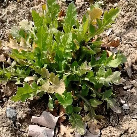 叶全部基生,叶片轮廓卵形至披针形,长3-8厘米,羽状浅裂、深裂或全裂,裂片2-4对,全缘或再次羽状浅裂或深裂,小裂片狭卵形、狭披针形或长圆形,先端急尖、钝或圆,两面稍具白粉,密被或疏被刚毛,极稀近无毛;叶柄长(1-)5-12厘米,基部扩大成鞘,被斜展的刚毛。