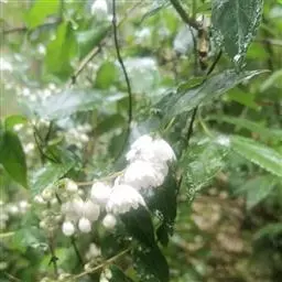 3)小花溲疏(Deutzia parviflora Bunge):灌木,高1-2米。树皮灰褐色,剥裂;小枝褐色,散生星状毛,老枝灰色,片裂。芽卵状圆锥形,有梭角,具褐色鳞片,密生星状毛。叶对生,叶柄长3-5毫米;叶片卵形,狭卵形或倒卵形,长3.5-8厘米,宽2-5厘米,基部广楔形或 圆形,先端渐尖,边缘具不规则的小锯齿,表面暗绿色,有5-6条放射状星状毛,背面同色,散生8-12条星状毛,沿主脉有单毛。花序伞房状,直径2-5厘米,花梗与萼密被星状毛,萼钟状,萼裂片5,广卵形,较尊简短;花瓣5,白色,圆状倒卵形,长4-6毫米,具星状毛;雄蕊10,花丝上部有短齿;子房下位,花柱3,比雄蕊短,宿存。蒴果扁球形,长2-3毫米,宽3-4毫米,多裂为3瓣,外被星状毛。种子多数,细小。花期6月,果期8-9月。生于阔叶林缘或灌丛中。分布于我国东北、华北,俄罗斯、朝鲜也有分布。栽植做庭园树供观赏。