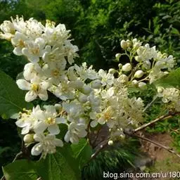 树皮薄片状剥落。小枝中空,红褐色,幼时有星状柔毛。圆锥花序,伞房花序、聚伞花序或总状花序,长5 cm~12cm,花瓣5枚,白色或外面略带红晕。