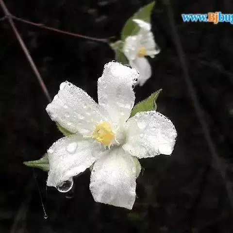 4)大花溲疏(Deutzia grandiflora):落叶灌木,高2m。叶卵形,长2.5~5cm,先端急尖或短渐尖,基部圆形,缘有小齿。花白色,径2.5~3cm,1~3朵聚伞状。花期4月,果熟期6月。野生山坡灌丛中,分布于辽宁、内蒙古、河北、陕西、山东、湖北等省。