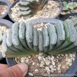 蓝黛莲是一种景天科厚叶草属植物。叶片呈略扁的圆柱形,排列成莲座状;颜色为灰绿色,…