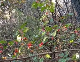 火棘 H. L. Li)是蔷薇科火棘属常绿灌木,老枝呈暗褐色;叶片呈倒卵形,边缘有钝锯齿,齿尖向内弯,…