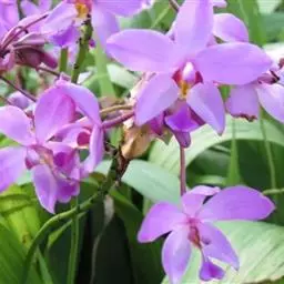 紫花苞舌兰:植株高达1米。假鳞茎卵状圆锥形,具3-5枚叶。叶质地薄,淡绿色,狭长,具折扇状的脉。…