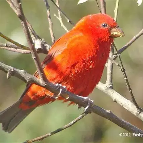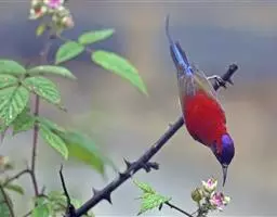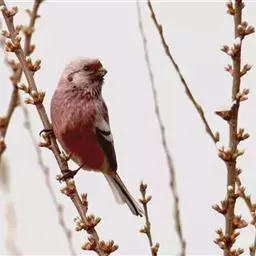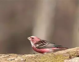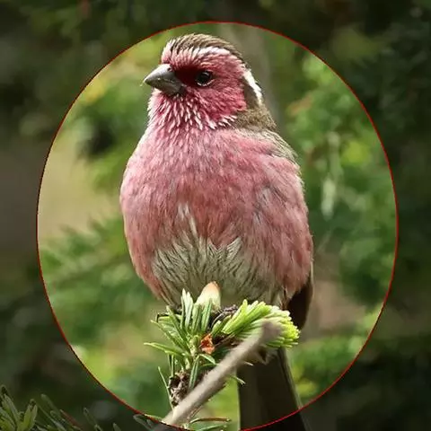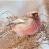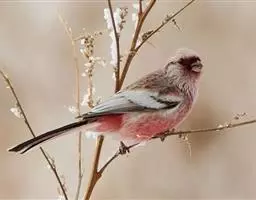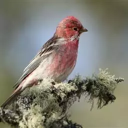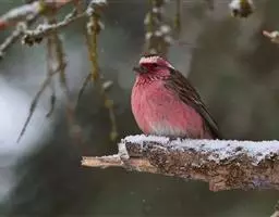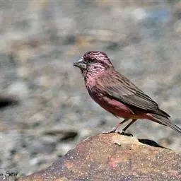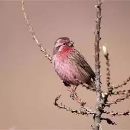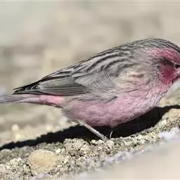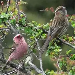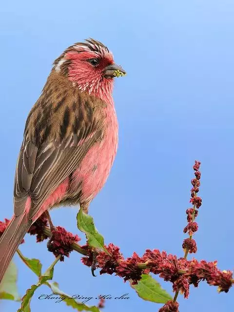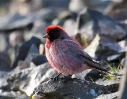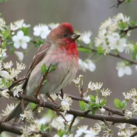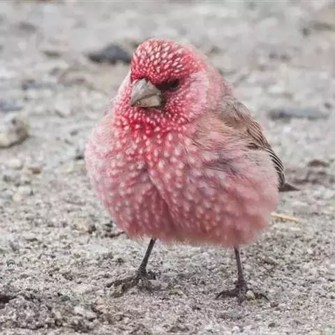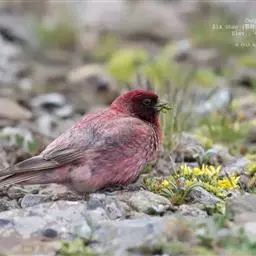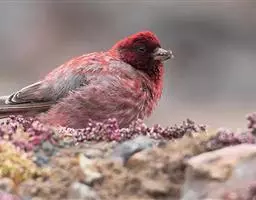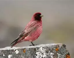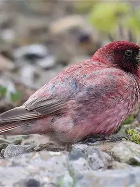 藏朱雀:全长约17-18厘米。雄鸟头部深红色具光辉,喉部暗红色具白色点斑;背部灰白色,各羽具玫瑰红…